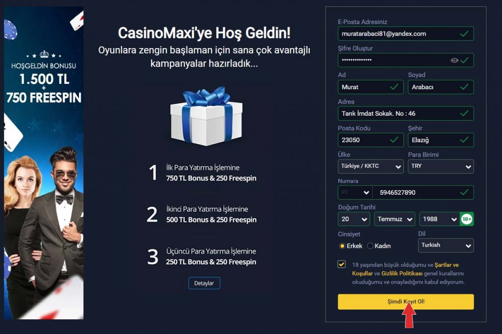 İlk olarak CasinoMaxi’ye giriş yapmalısın ve sitenin sağ üst köşesinde yer alan “Şimdi Kayıt Ol” butonuna basmalısın.