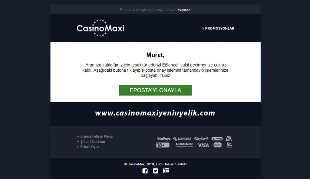 İkinci olarak E-posta adresine CasinoMaxi tarafından aktivasyon maili gelecek, mailin ortasında yer alan yeşil E-postayı onayla butonuna bas 📱